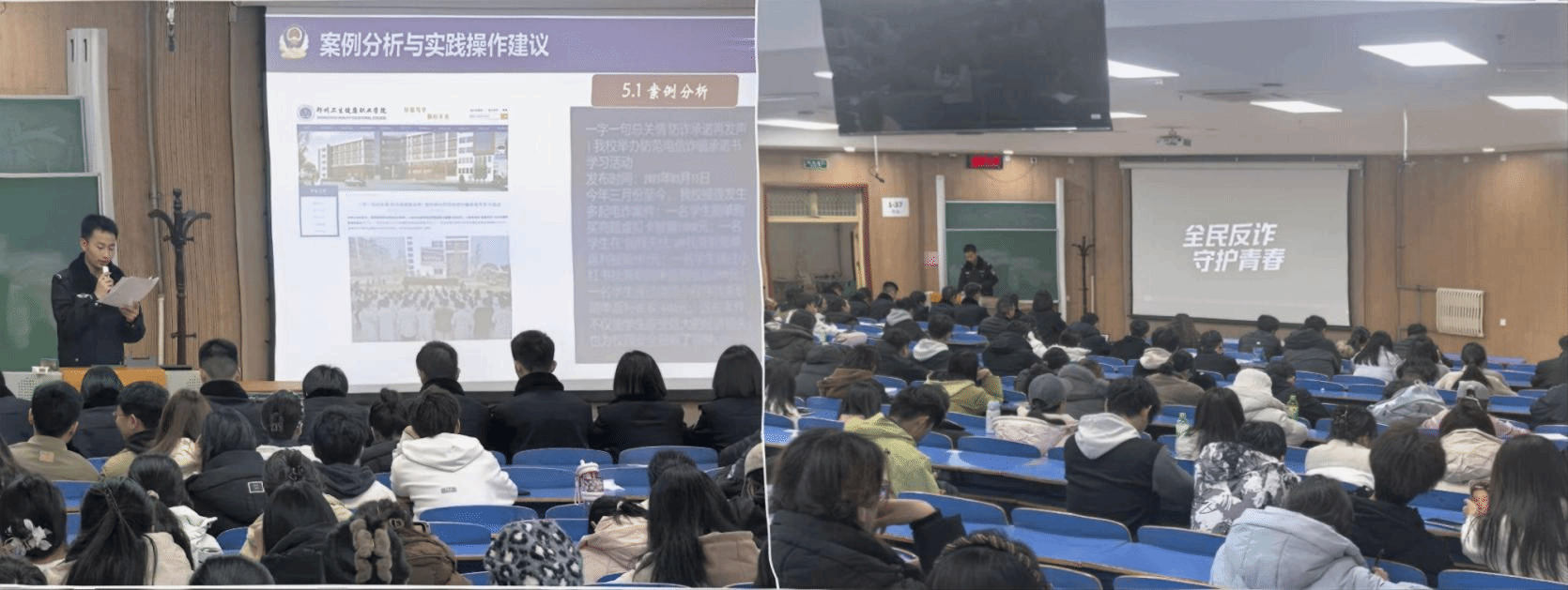 (图/文 雷彦宏)由博学路派出所与河南警察学院交通管理系联合主办的"思政星光·学警思语"反诈主题宣讲活动,于2025年12月2日下午在我校教学楼多功能厅成功举办。本次活动以"虚假购物""刷单返利"两大高发诈骗类型为核心,通过沉浸式案例剖析、情景模拟演练等形式,为271名在校师生带来了一场别开生面的反诈安全课。